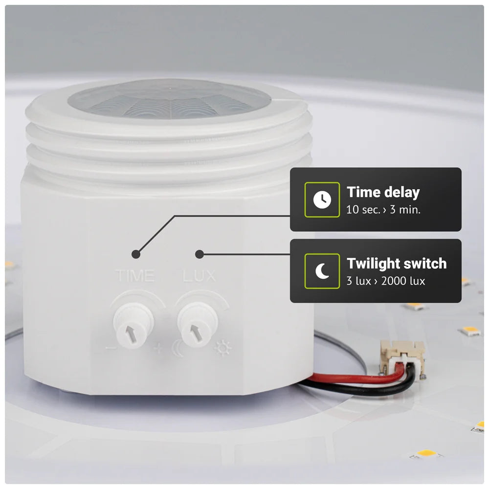 Senzorul este reglabil. Se poate regla distanta de detectie, timpul de functionare cat si fotocelula de lumina ambientala, astfel lampa se poate aprinde doar noaptea.