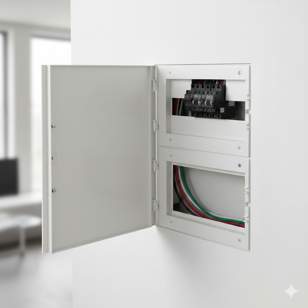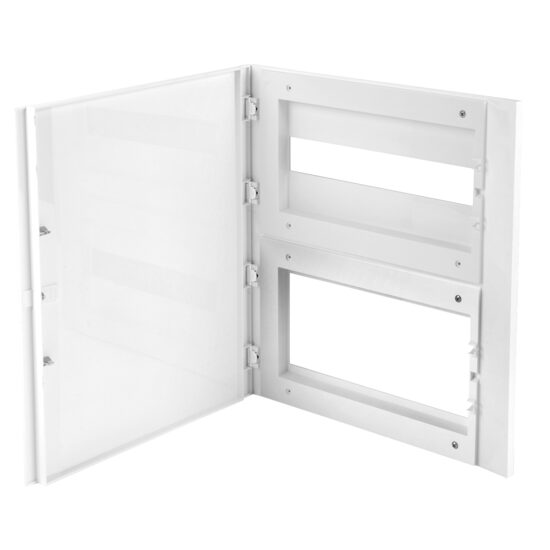 Finisajul alb ofera un aspect estetic placut, curat si organizat, integrandu-se discret in perete sau in spatiul de montaj. Capacul mascheaza modulele neutilizate si cablajele interne, rezultand o instalatie ordonata si profesionala.