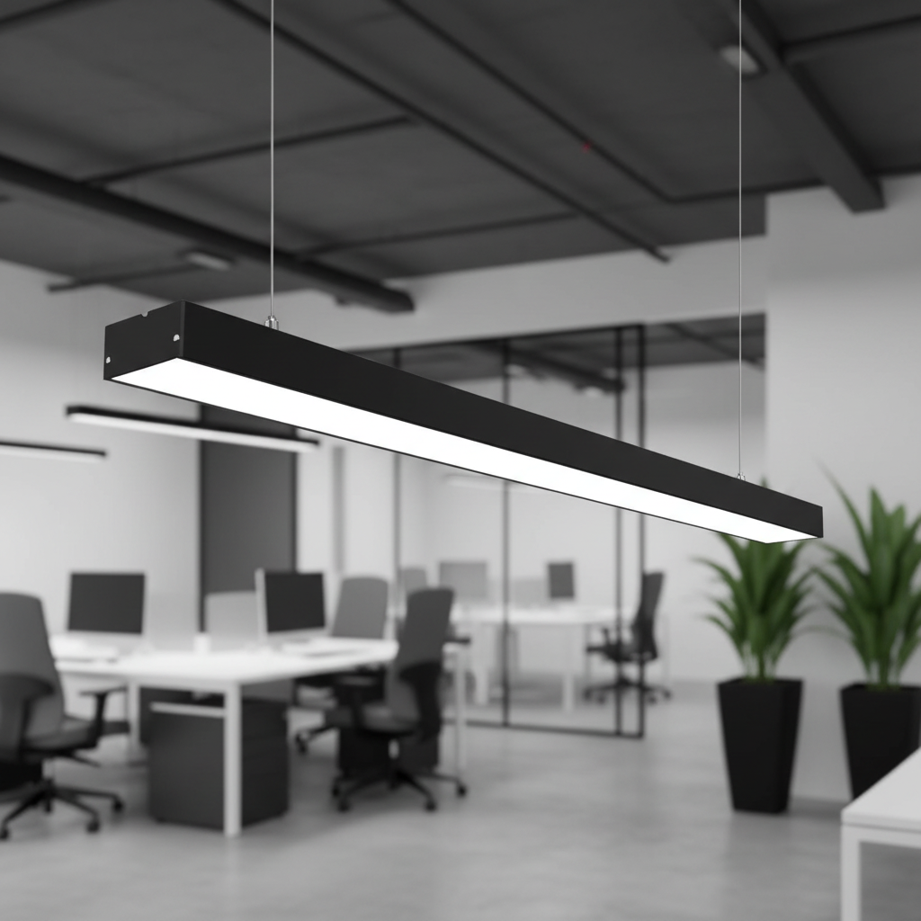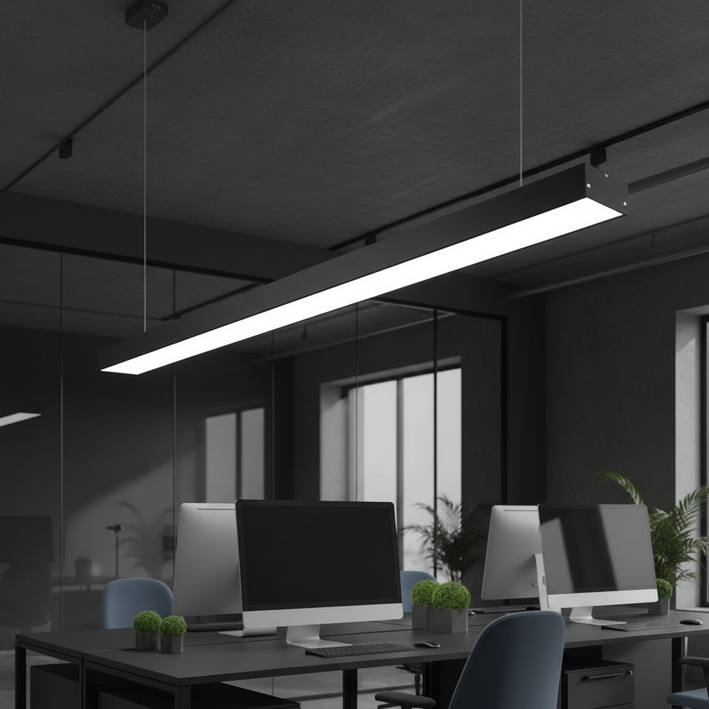 BRILLOX 120cm este un corp LED liniar conceput pentru spatii moderne in care ai nevoie de iluminare clara si uniforma. Profilul sau ingust si finisajul negru ofera un aspect profesional, potrivit pentru birouri, co-working, receptii sau incaperi cu design industrial. Poate fi montat atat suspendat, cat si aplicat, oferind flexibilitate maxima in amenajare.