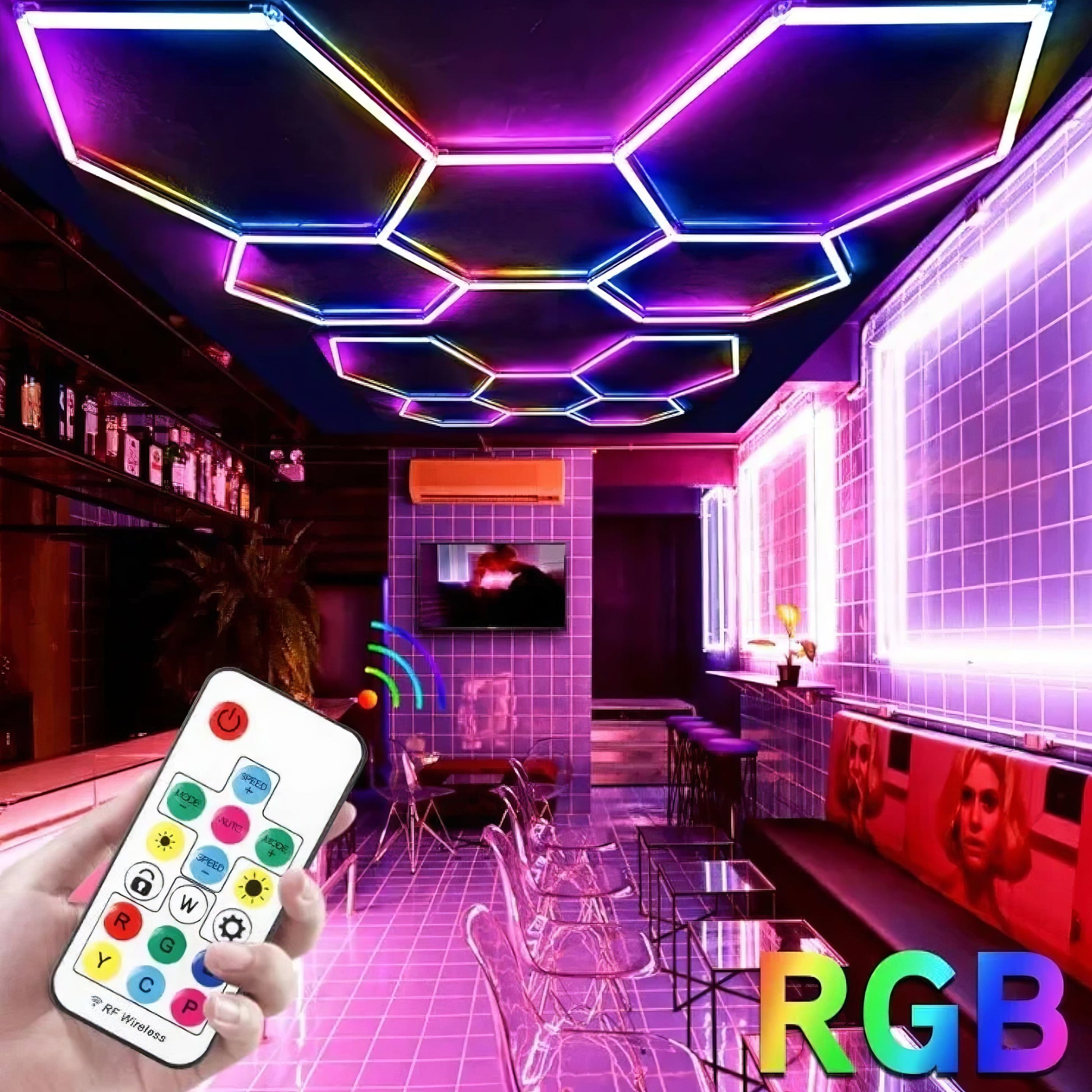 Plafoniera LED HoneyComb RGB aduce un aspect modern si spectaculos oricarui spatiu, datorita structurii modulare din cinci hexagoane perfect delimitate. Lumina multicolora creaza un efect vizual unic, ideal pentru garaje, sali de fitness, studiouri, detailing sau zone comerciale. Controlerul digital si telecomanda permit schimbarea culorilor rapid, oferind o experienta versatila si personalizata.